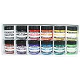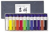 吉祥 水干絵具瓶入12色セット 価格: 3,780円 レビュー評価: レビュー数: 使う時は、膠液で溶いて使います。陶器製の皿に絵具を出し、少しずつ膠液をくわえ、指の腹で練るようにして丁寧になじませます。絵具と膠液がすっかりなじんだら出来上がり。使う時は、水でといて濃度を調整します。量を多く作りたい場合は、乳鉢でよく塊をすりつぶしてから膠液と混ぜていきます。人形の顔や能面を塗るなど、他の工芸・美術に使われて良く知られている胡粉も、水干絵具の仲間です。胡粉の場合は、カキ殻などの貝殻を粉砕して作られたものです。この絵具は、色が豊富で、安価で、意外と扱い易くて、日本画を描いてみたいとお思いの方には丁度いい絵具です。●約20cc棒ビン入12色セット●60・5・9・8・30・34・7・ |